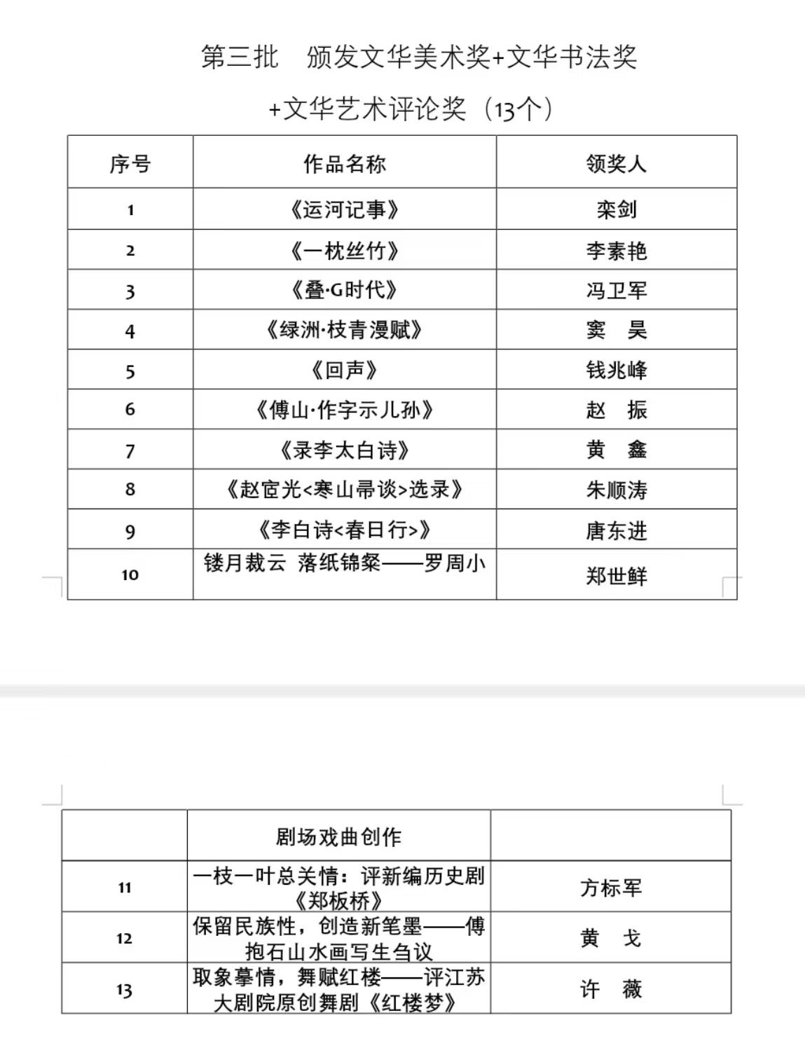 据悉, 江苏省文华奖是经省人民政府批准设立的省级专业艺术领域政府最高奖项,旨在表彰在艺术创作和表演方面取得突出成就的单位和个人,代表我省艺术创作的最高水平。奖项涵盖戏剧、音乐、舞蹈、美术、书法(含篆刻)、摄影、曲艺、杂技、民间文艺、艺术理论评论等多个专业类别,全面覆盖舞台艺术与视觉艺术、创作实践与理论研究等艺术领域。今年共评选出获奖作品及个人125项,其中书法领域全省仅有5位作者获文华奖。