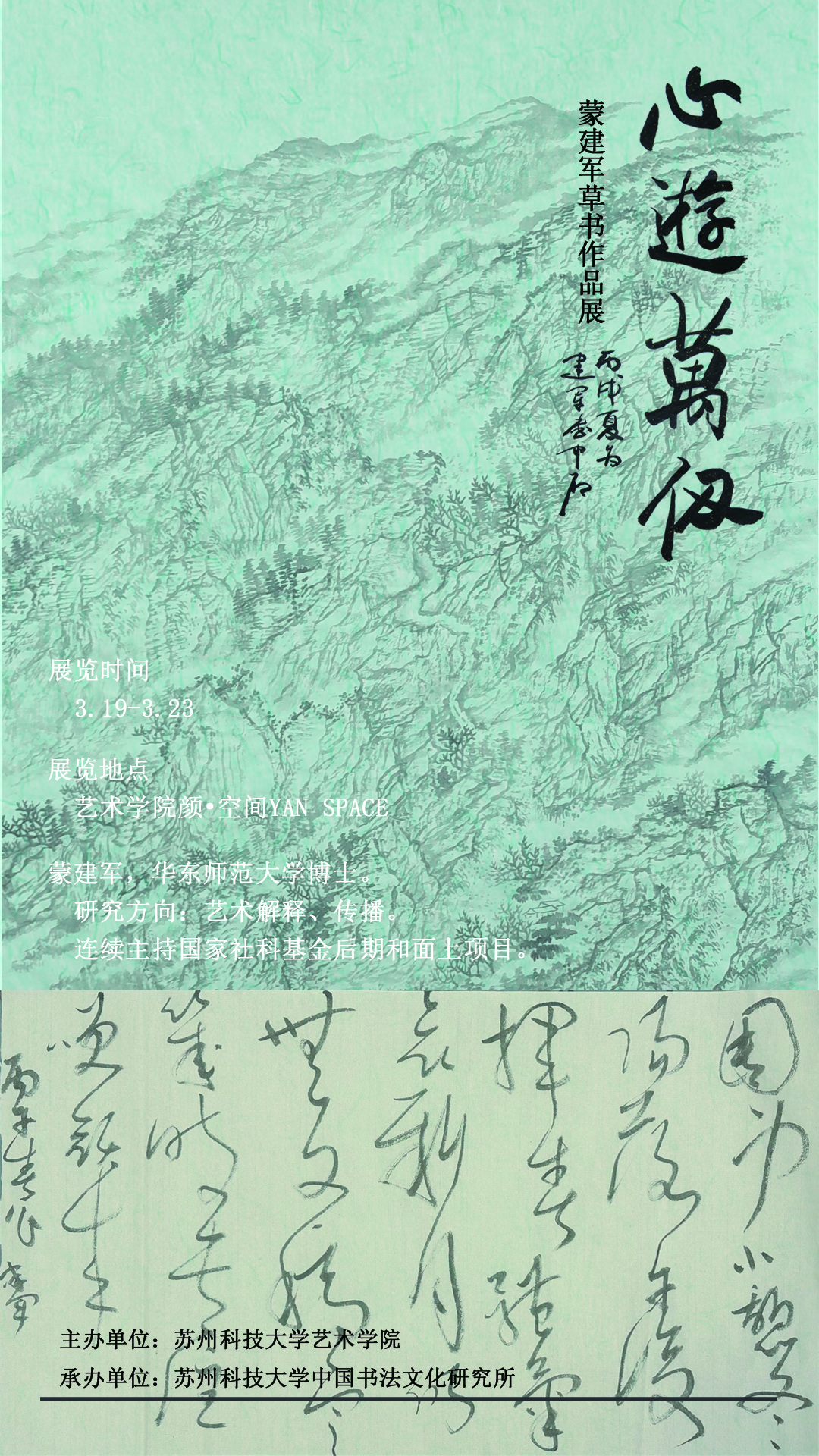 美术与书法专业学位(书法创作与教育方向)校外导师受聘仪式举办之际,“心游万仞——蒙建军草书作品展”在线上娱乐